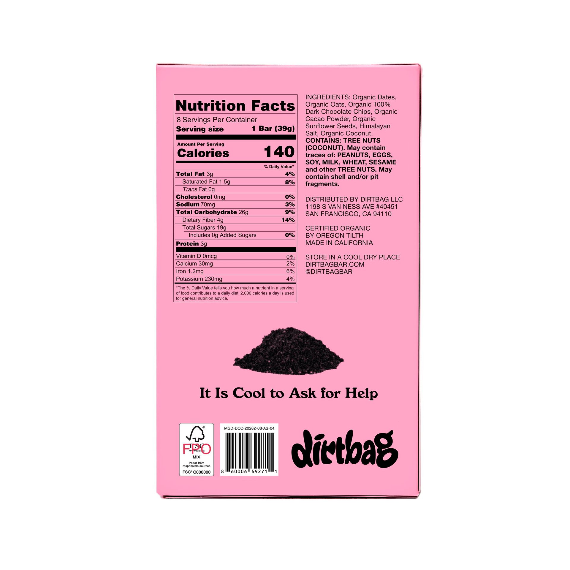 Dirtbag Bar is a nutrient-dense source of whole food, plant-based energy for your endurance activities and everyday adventures. Made with dates, 100% dark chocolate, rolled oats, and sunflower seeds. Made without added sugars, powders, oils, or syrups.